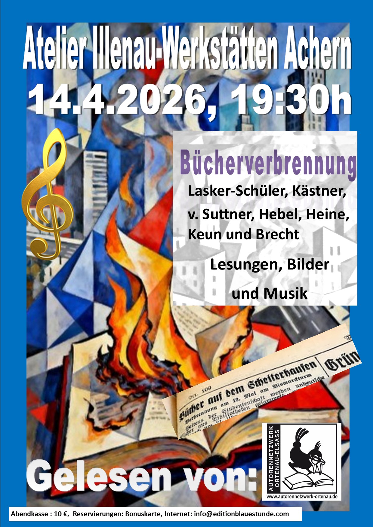 A m 10. Mai 1933 loderten in deutschen Universitätsstädten die Scheiterhaufen. Tausende Bücher von jüdischen, marxistischen, pazifistischen und anderen nicht dem damaligen Mainstream folgenden Autorinnen und Autoren wurden öffentlich verbrannt – und mit ihnen Menschenrechte, Menschenwürde und die Freiheit des Denkens. Am Montag, dem 14. April, ab 19:30 Uhr erinnert das AutorenNetzwerk Ortenau-Elsass® im Atelier der Illenau-Werkstätten in Achern an jene verfemten Stimmen, die zum Schweigen gebracht werden sollten und deren Worte dennoch überdauert haben.